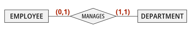 해석: EMPLOYEE 는 DEPARTMENT 를 관리할 수도 있고 안 할 수도 있다. DEPARTMENT 에는 관리하는 직원이 반드시 1명 있어야 한다.