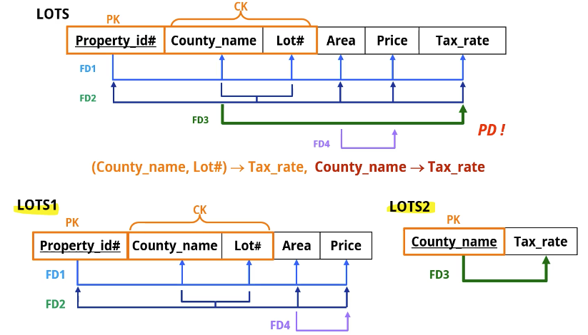 EMPLOYEE(Ssn, Ename, Bdate, ...) , {Ssn, Ename} -> Bdate 일때 Ssn만 갖고도 Bdate를 결정할 수 있다. Ename이 없어도 된다. 이런 경우를 부분 함수 종속(PD)이라 한다.