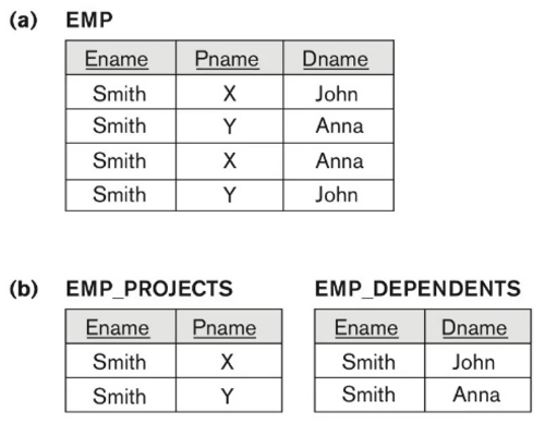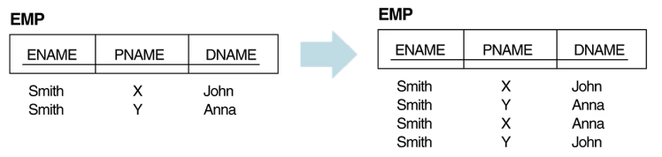 EMP를 (ENAME, PNAME) , (ENAME, DNAME) 로 분리했다가 다시 합치면 오른쪽 처럼 잉여 튜플들이 생긴다.